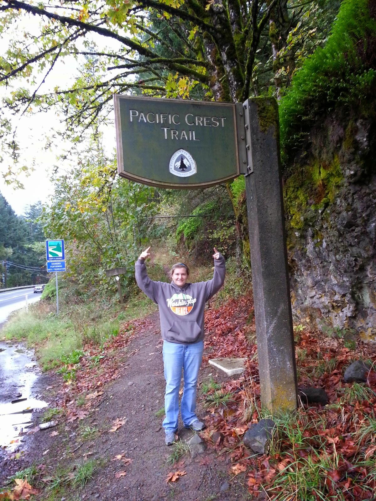 It was really nice not to have to be at work but with Ben geocaching and traveling with him to our destination. It felt so nice. I decided to get one more cache before we drove over the Bridge of the Gods. Since we were driving past another portion of the PCT I had to stop and get it. We had about 19 miles of swirly Hwy 14 to go until we got there. When we did arrive, we had to do a U-turn so we could park safely onto the pull out near the trail head. This one was more defined than the one I visited up by White Pass a few weeks back. It's probably because it's welcoming you to Washington.