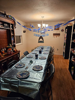 We got back, Trish had the oven preheated, stuck in the first one while we hung out and watched the start of the Duck and Beaver Civil War. I had about two pieces of pizza and called it good. I didn't need to stuff myself. We cleaned the table off, we put the other leaf in and then covered it with a sheet.